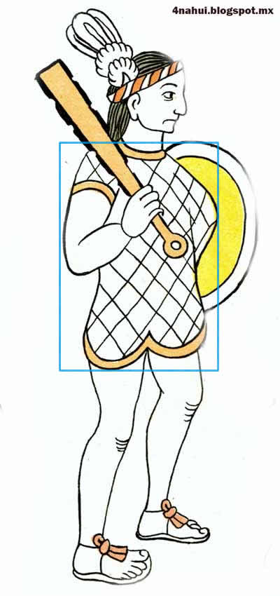 This protective costume was a sleeveless, thickly-padded tunic, stuffed with raw cotton and encased either by reeds, animal hide or quilted cloth. No doubt the armor was worn by warriors of all cultural groups and classes from the Classic period on, thus serving as Mesoamerican basic martial attire. Indeed, the heavily-quilted cotton armor was so effective that the Spanish conquistadors quickly adopted it.
